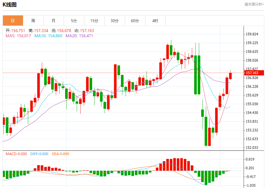 今日周四,截止目前美元兑日元报157.217,上涨0.23%。