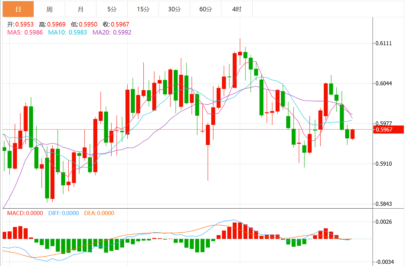 从日线图来看,该货币对在纽元/美元面临0.5994的关键阻力后,走势偏向横盘至下行,交易者缺乏重新夺回0.60关口的力量。 在下行过程中,该货币对突破了50日和100日移动平均线,分别位于0.5952和0.5944,这在撰写时转变为关键阻力位。