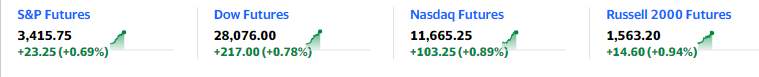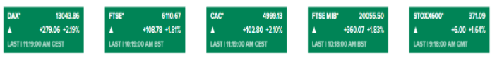 欧美股市:欧洲股市今天高开高走,截止发稿,主要股指涨幅都超过或接近2%,德国DAX30指数、英国富时100指数、法国CAC40指数、意大利富时MIB指数、欧洲斯托克600指数分别上涨2.2%、1.8%、2.1%、1.8%和1.6%。美国股市期货同样悉数走高,道指期货涨超200点或0.8%;标普500指数期货、纳斯达克指数期货、罗素2000指数期货分别上涨0.7%、0.9%和0.9%。