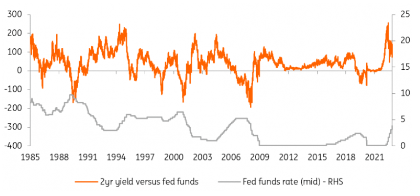 那曲线呢?主要的主题是反反转,最终是曲线变陡。目前看到的50bp反转应该首先从前端展开。当美联储达到5%的峰值时,2年期国债收益率应该从4.5%的区域移开,以便在未来几年迅速计入较低的联邦基金利率。