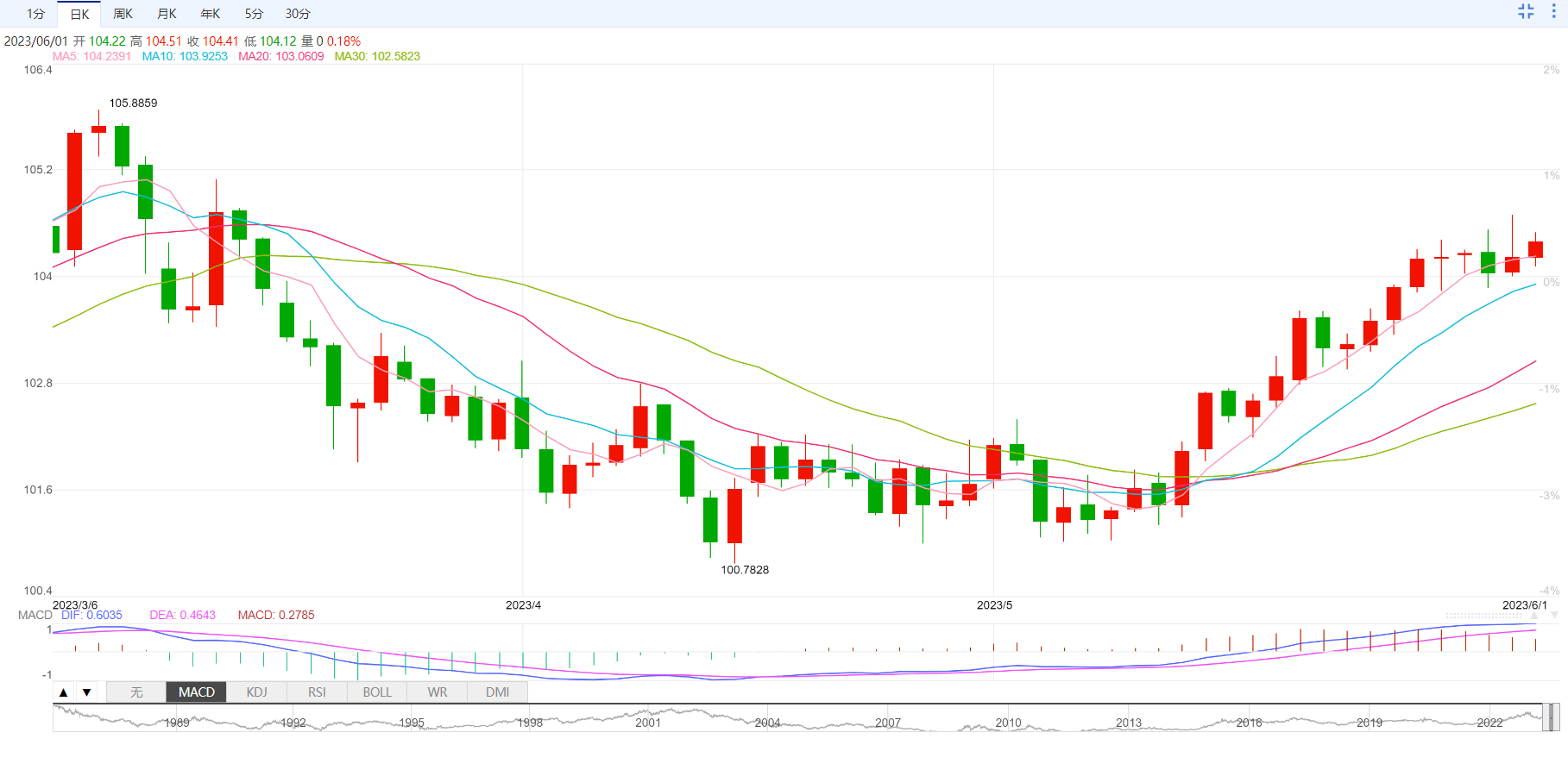 现在,美元指数上涨0.24%至104.48,突破104.69(5月31日的月高点)将打开通往105.61(200日移动均线)的大门,然后是105.88(3月8日的2023年高点)。
