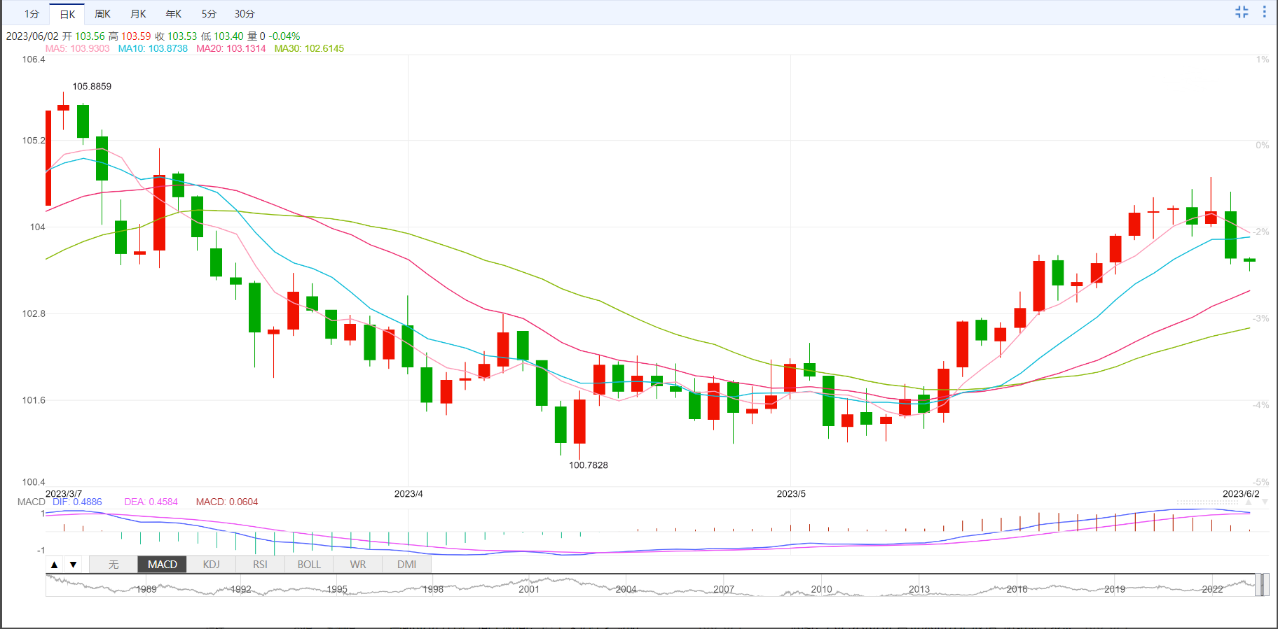 现在,美元指数下跌0.08%至103.48,并面临下一个支撑位在100日移动均线102.91,随后是55日移动均线102.41,最后是101.01(4月26日的周最低价)。