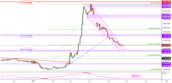 自4月初美元/印尼盾筑顶以来,汇价一直加速下行,构筑了一个下降楔形形态,并跌破了始于2以来的上升趋势线。但自美元/印尼盾突破楔形上轨以来,汇价几乎在61.8%斐波延展为14773附近保持不变。需要记住的是,印尼央行正在进行干预以稳定本币,因决策者认为本币被严重低估了,因此印尼盾的任何疲软可能都会被央行的干预所抵消。
