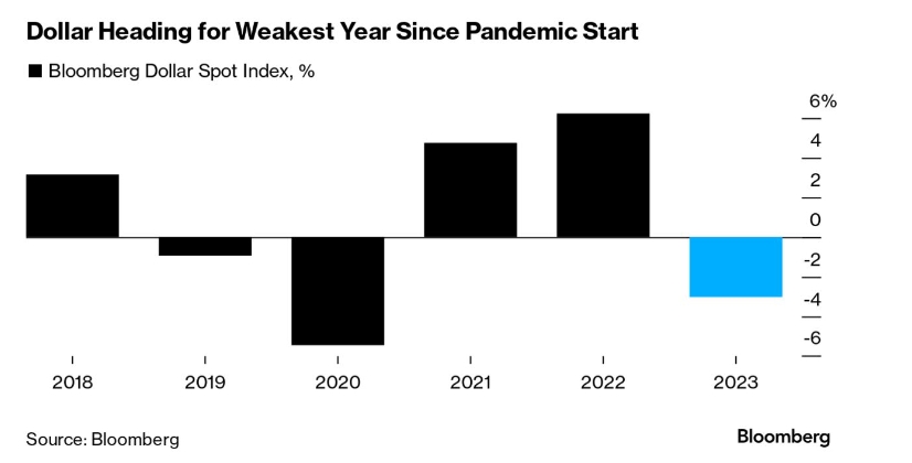 由于华尔街押注美联储将在安全控制住物价后降息,美元将遭遇疫情暴发以来表现最糟糕的一年。loorg 美元指数自1月份以来下跌了近3%,这是自2020年以来的最大年度跌幅。美元的大部分跌幅发在在第四季度,因为越来越多的人押注美联储明年将随着美国经济放缓而大幅放松政策。掉期交易员目前预计美联储将至少降息150个基点,