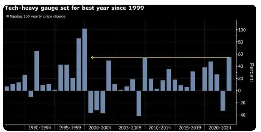 美股接近收官,在人工智能欣欣向荣、市场押注美联储鸽派转向的背景下,大型科技股的涨势使得市场接近历史高点。在2023年的收盘钟声最后一次敲响之前,纳斯达克100指数迈向1999年以来的最佳年度表现,市值年增7万亿美元;标普500指数逼近纪录高位。纳斯达克100指数周四下跌约0.1%,报16898.47点;今年迄今涨超54%。