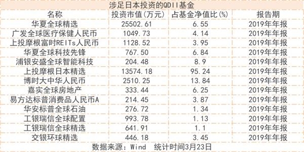 除此之外,QDII基金中也不乏投资日本市场的产品,除了像上投摩根日本精选这样的产品外,大部分基金投资于日本市场的比例不会超过10%。从数据来看,2019年末QDII在日本市场的投资市值和占比较上一年均有不小的增加。数据显示,截至2019年四季度末,共有13只QDII基金投资日本市场市值达到4.76亿元。