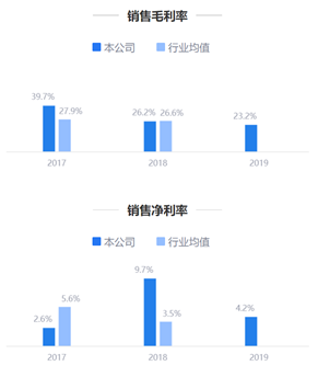 2017年-2019年,天际股份的销售毛利率分别为39.7%、26.2%、23.2%,连续三年下滑;而销售净利率则分别为2.6%、9.7%、4.2%,净利率波动较大;净资产收益率上,公司2017年-2019年的净资产收益率分别为0.7%、2.5%、1.0%,行业在2017年和2018年的平均净资产收益率分别为13.3%、7.6%,显著高于天际股份,偏离度超过50%。