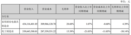 而厨房家电业务方面,公司称受房地产调控政策及市场激烈竞争的影响,我国家电行业的发展整体有一定程度的放缓,报告期内公司家电销售额较上年同期下降1.07%,利润额也随之下降。