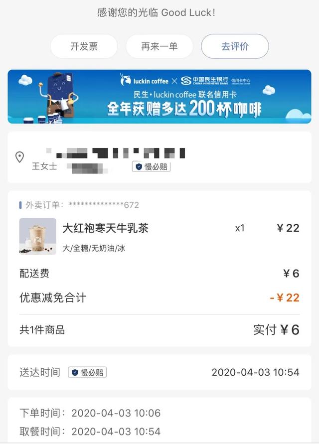 “上午点了2杯,差不多花了一个小时多才送到。”恐慌之下,吴甫不想浪费优惠券。