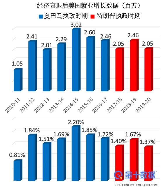 截至奥巴马任期的最后一个月,美国共增加了683.8万个工作岗位,即每月增加22.1万个工作岗位,随后特朗普就职。在减税政策的帮助下,特朗普在任期的前31个月,创造的就业增长总量为5345万,即每月17.2万,每月比奥巴马的业绩低了4.8万。