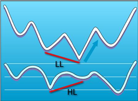 如果价格低点不断走低(LL),但是震荡指标低点却不断走高(HL),那么,这就是我们常见的常规多头背离。