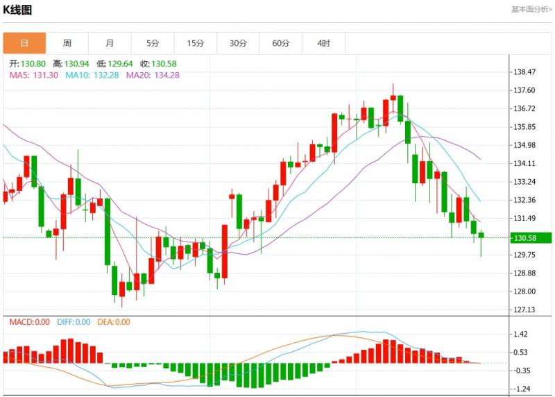 周五盘中,美元日元报130.57,跌幅0.14%。