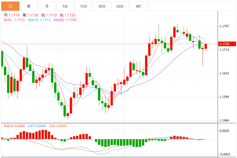 周二,欧元/美元徘徊于1.1736下方,现交投于1.1735附近,涨幅0.12%。