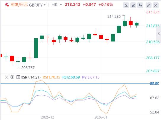汇价在214.27形成阶段性顶点后回落,盘中偏向转为中性。下行方面,预计210.28将提供强劲支撑并引发新一轮反弹;若有效下破210.28,则将确认短期见顶,打开更深回调空间。上行方面,若突破214.27,将恢复主要上涨趋势,目标指向184.35至205.30区间的61.8%回撤位及219.99高点。需注意的是,4小时图MACD指标出现死叉信号,若坚硬跌破210.28,将强化回调预期。