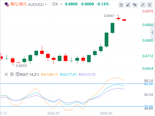 澳元(AUD)对美元(USD)受到支撑,因为政府债券收益率提升,政策敏感的三年期债券收益率升至4.27%,为自2023年11月以来的最高水平,这得益于对澳大利亚顶级信用评级的信心以及央行鹰派政策前景的支持。