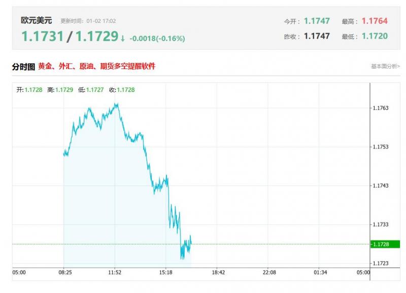 截至目前,欧元/美元下跌0.16%,报1.1729。
