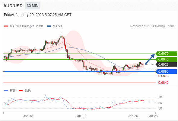 澳元/美元汇率今日分析:在 0.6890 之上,看涨,目标价位为 0.6945 ,然后为 0.6970 。在 0.6890 下,看空,目标价位定在 0.6870 ,然后为 0.6840。