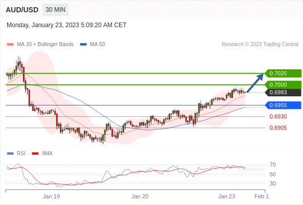 澳元/美元汇率今日分析:在 0.6955 之上,看涨,目标价位为 0.7000 ,然后为 0.7025 。在 0.6955 下,看空,目标价位定在 0.6930 ,然后为 0.6905。