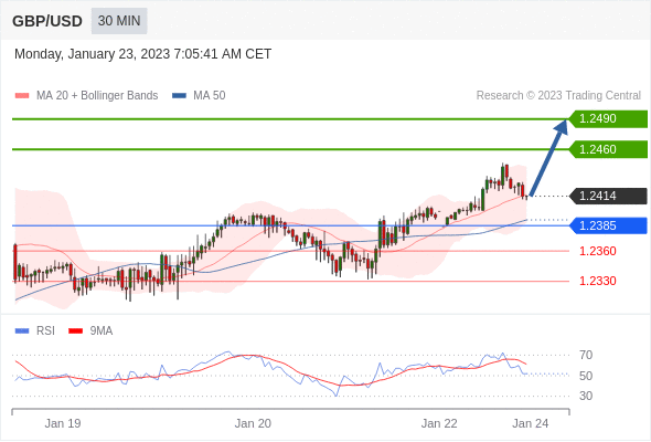 在 1.2385 之上,看涨,目标价位为 1.2460 ,然后为 1.2490 。备选策略: 在 1.2385 下,看空,目标价位定在 1.2360 ,然后为 1.2330。
