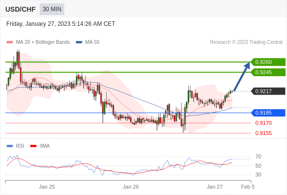 周五(1月27日)盘中, 美元/瑞郎暂报0.9222,涨为0.0024,涨幅0.26%。