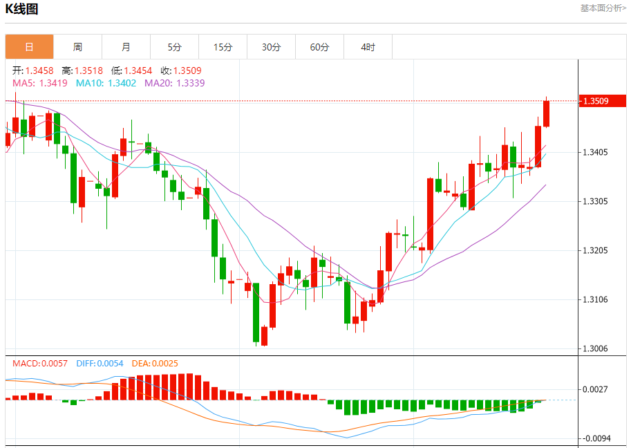 周二盘中,英镑/美元报1.3509,涨幅0.38%。