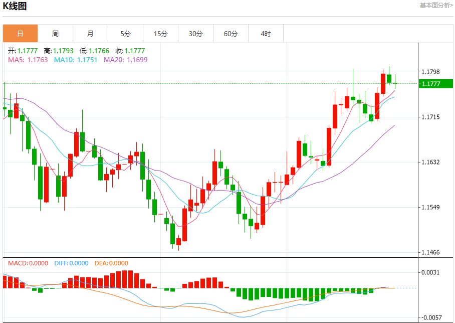 周五盘中,欧元/美元报1.1777,跌幅0.14%。