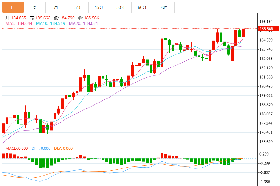 今天的预期交易范围:在184.85和185.55之间