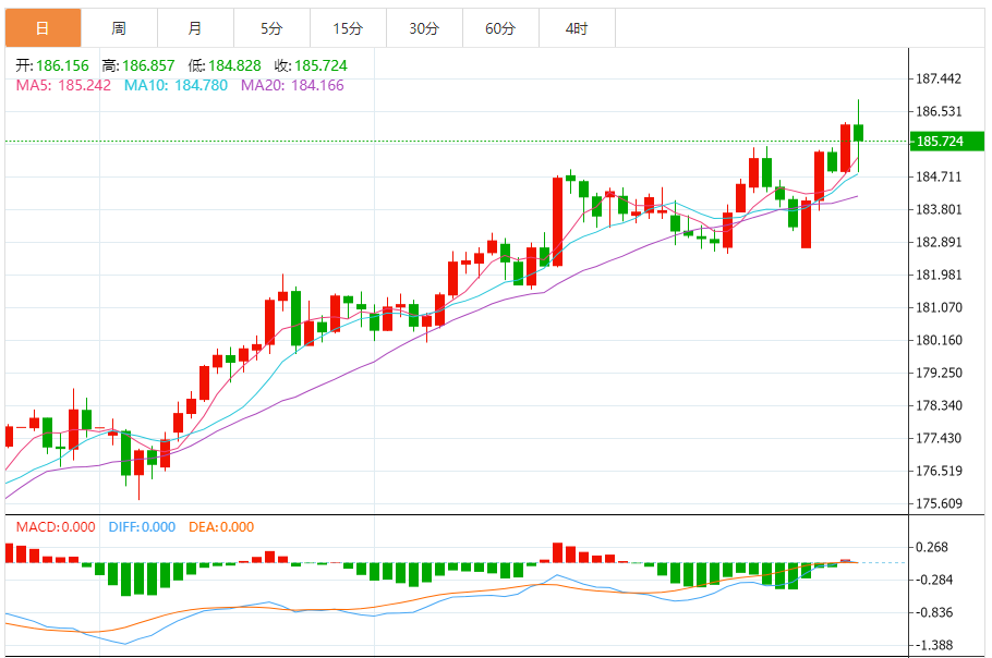 周五,欧元/日元下跌0.25%至185.728附近。
