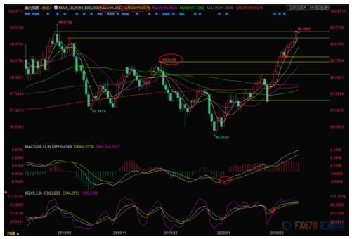此外,由于99.67附近阻力较强,KDJ也持续发出短线超买信号,如果不能上破该阻力,汇价或将迎来短线回调行情;初步支撑在5日均线99.26附近;10日均线支撑在99.00附近,若回落至该位置下方,则增加短线见顶信号;较强的支撑在2月11日低点98.70附近,该位置的得失将影响中线走势的判断,需要重点关注。