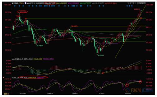 2小时级别:单边上涨后高位震荡;MACD顶背离后形成死叉,汇价上方面临100整数关口阻力,短线存在一下回调风险,布林线中轨支撑在99.67附近,若跌破99.67附近支撑,则汇价可能会进一步跌向布林线下轨,目前该支撑在99.35附近;短线的话,99.52附近也存在一些支撑。