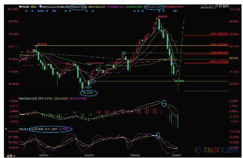 4小时级别:单边下跌后低位震荡;目前MACD金叉,KDJ金叉,若能顶破布林线中轨97.64附近阻力(接近23.6%回撤位),则增加短线看涨信号;进一步阻力参考38.2%回撤位98.07附近;布林线上轨在50%回撤位98.42附近。
