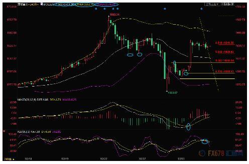 4小时级别:震荡;KDJ重新结成死叉,留意布林线中轨1619.33附近支撑,若跌破该支撑,则增加后市看空信号。进一步支撑分别参考1611.54和1593.60位置。