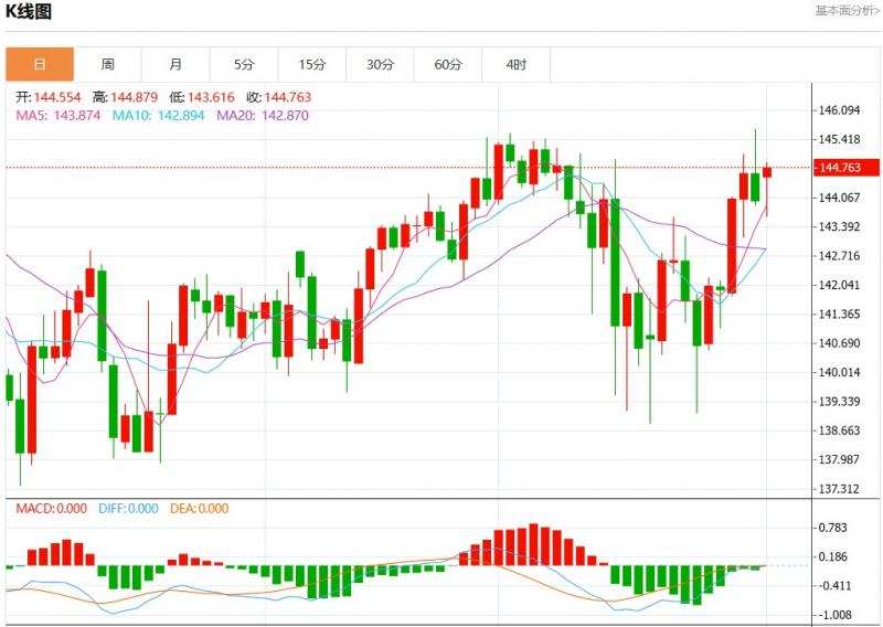 周一盘中,欧元日元报144.744,涨幅0.54%。
