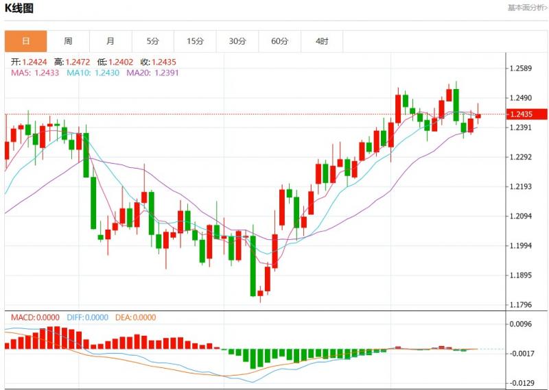 周三盘中,英镑美元报1.2435,涨幅0.12%。