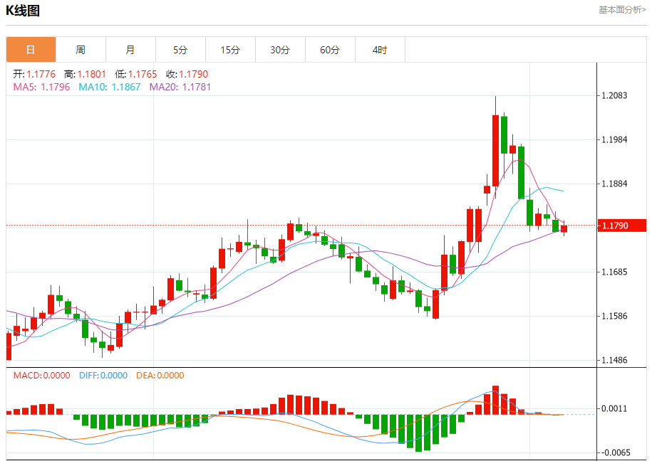 汇价高见1.1801,低见1.1765。上一交易日,汇价收于1.1777。
