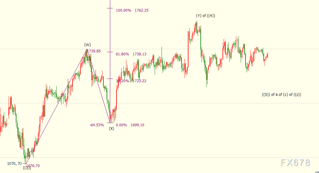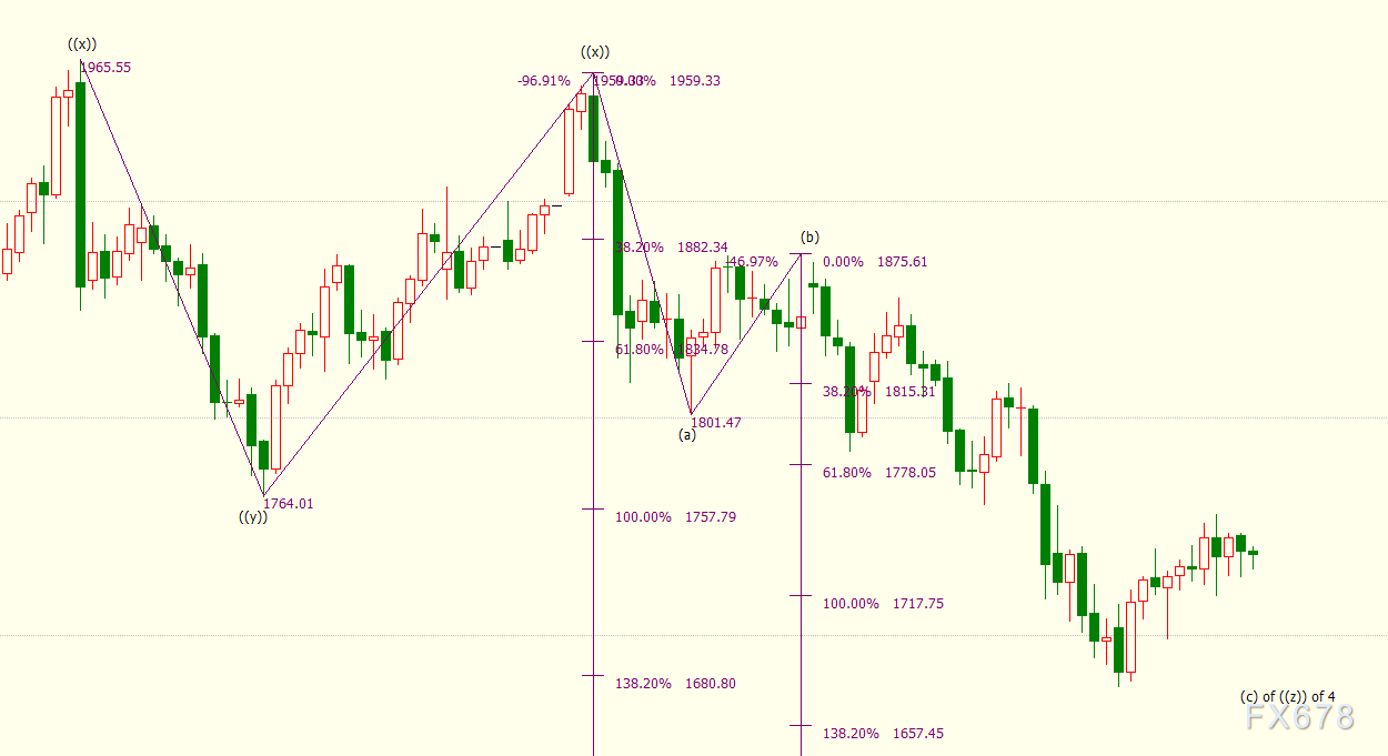日线上看,iii浪是自1876美元开启的下行(c)浪的子浪,(c)浪的138.2%目标位在1657美元。(c)浪是自1959美元开启的下行((z))浪的子浪。((z))浪的161.8%目标位在1633美元。((z))浪隶属于自2075美元开启的4浪调整走势,4浪呈现((w))((x))((y))((x))((z))三重“之”字调整模式。