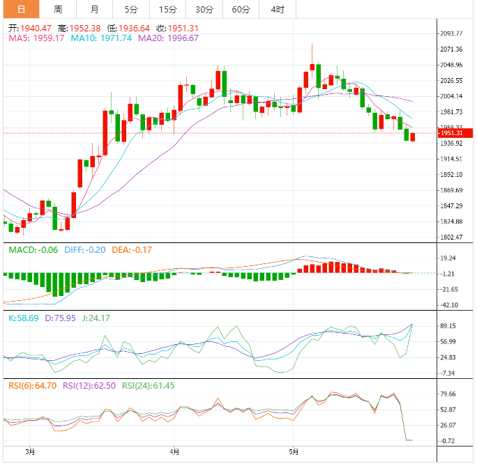 技术面:金价在突破1952-1985美元区间内形成的盘整后,已转向失衡。金价已转入看跌区域,预计将在5月13日高点1,914.67美元附近找到支撑。相对强弱指数(RSI)(14)已下滑至40.00下方,没有显示出背离的迹象,而且没有超卖的迹象,支撑了未来的疲软。