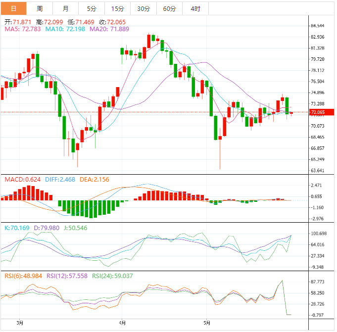 技术面:WTI原油在两个月上涨支撑线和50日移动均线附近走高,分别在71.65美元和74.60美元附近。