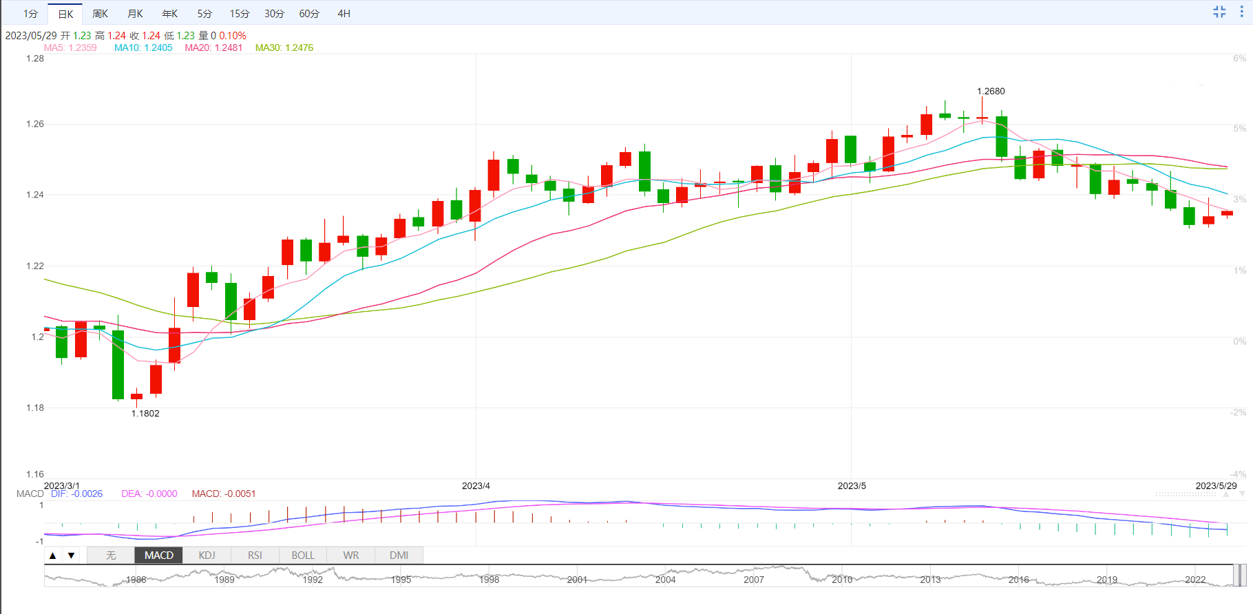 美元指数:截止发稿,美元指数下跌,现报104.05,跌幅0.17%。欧市盘前,美元指数在104.25-30之间徘徊,由于美国国会通过债务上限协议存在不确定性,美元指数努力为其欢呼。此外,多个市场的假期和本周美国就业报告前的谨慎情绪可能会对美元指数的买家构成挑战。
