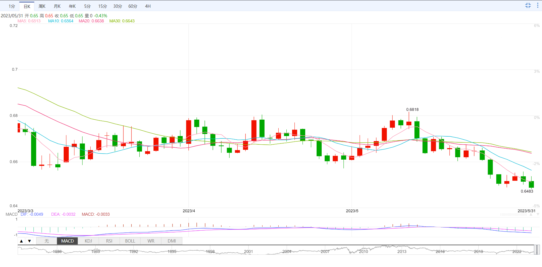 澳元兑美元周三冲高回落,盘中一度涨至0.6537附近,因澳洲4月CPI数据强于市场预期,但汇价很快回落,一度创下本周新低至0.6491,跌幅约0.38%,因中国5月PMI数据弱于市场预期。