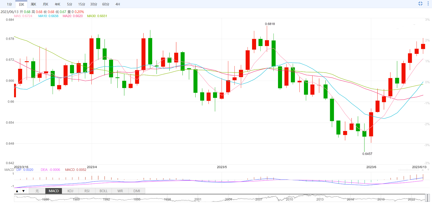 澳元兑美元目前上涨0.16%,报0.6759美元,上一交易日触及0.6772的一个月最高点。