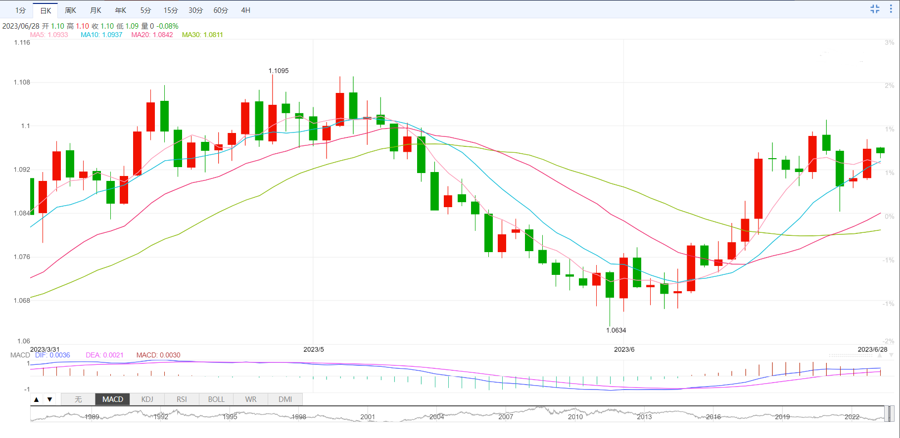 欧元/美元拉锯于1.0950附近。欧元/美元试图明确方向,因为投资者正在等待美联储主席杰罗姆-鲍威尔的讲话,以获得关于利率的进一步指导。欧元区方面,欧央行行长拉加德在欧洲央行中央银行论坛上发表鹰派讲话后,欧元在周二仍出现较大波动。欧洲央行拉加德表示,欧元区通货膨胀处在非常高的水平,央行需要使货币政策具有足够的限制性以抑制价格压力。工资上涨对通货膨胀的影响最近得到放大。