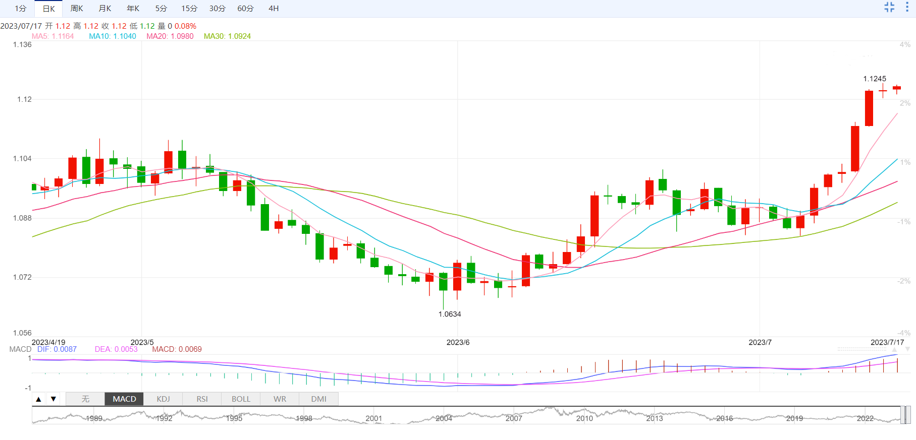 欧元/美元在1.1200的整数关口阻力位上方波动加大。欧元/美元维持盘整,投资者正在等待美国6月零售销售数据提供进一步指引。由于欧元区通胀升温,欧洲央行预计将决定7月以后的加息倾向,欧元因此极为强劲。欧元区整体通胀率为5.5%,不包括石油和食品价格波动的核心通胀率为5.4%,与2%的目标通胀相差甚远。如果日收盘价超过前一日的峰值1.1245,则将突破最新烛台形态所支持的看跌偏见。
