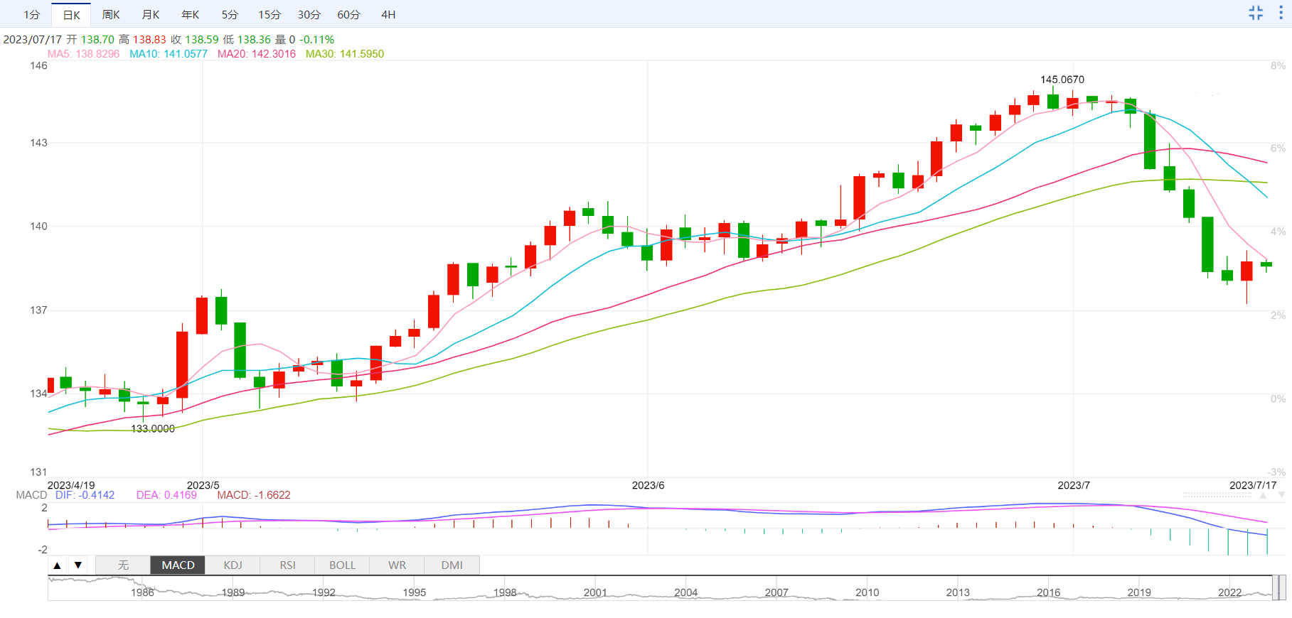 元/日元小幅下跌至138.60附近,市场参与者等待新线索以延续周初回撤。该货币对回吐前日自5月中旬以来最低水平的反弹修正行情。不过未能突破3月底以来的前支撑线以延续上週五晚间自数日低点以来的修正反弹行情唤醒美元兑日元空头,该线目前在139.35附近构成短期阻力位。不过该货币对在3月底至6月期间升势的50%回档位接近137.40,加上MACD信号看涨,RSI接近超卖,将挑战其进一步下跌。