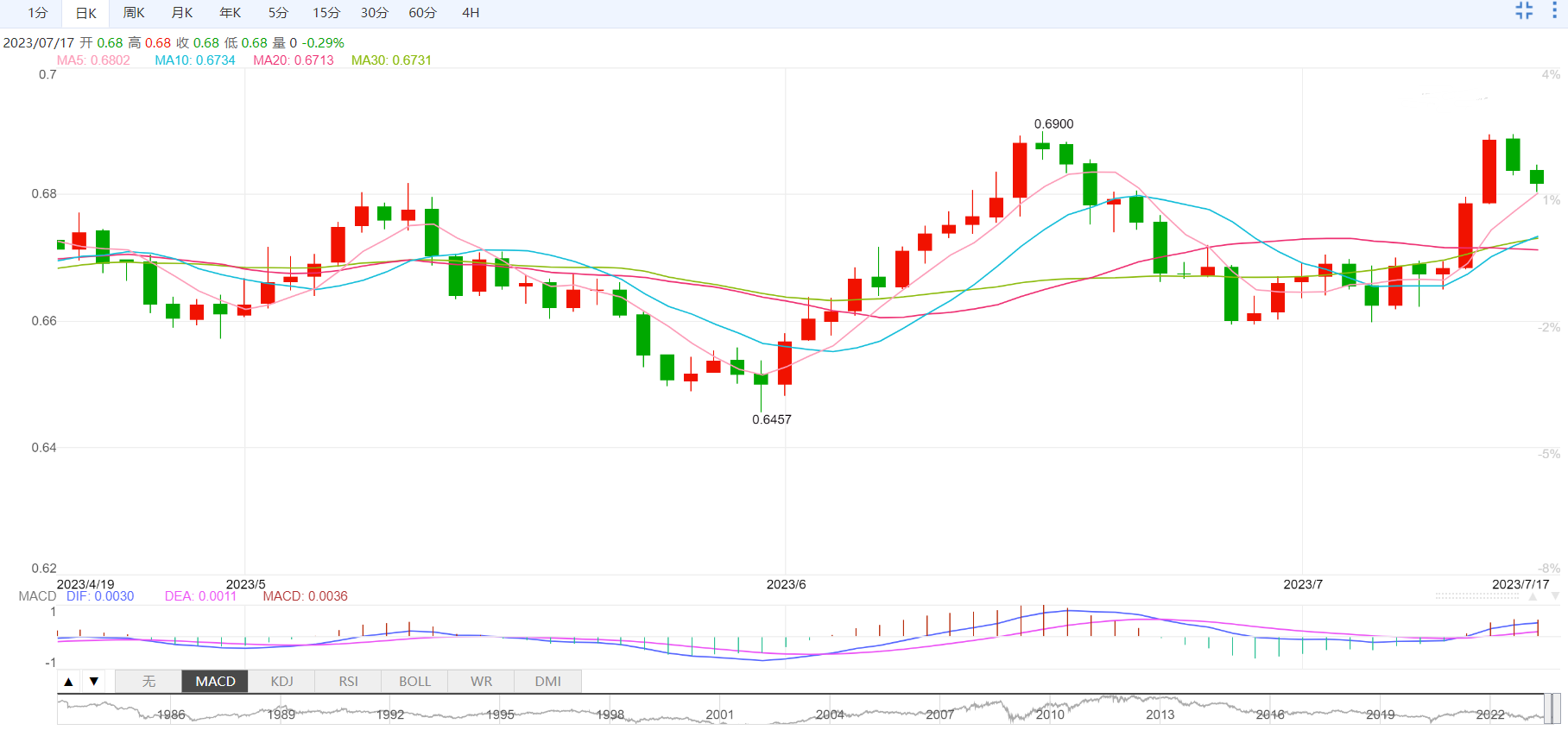 澳元/美元从日内低点反弹至0.6820,在本周开局低迷的情况下收窄日内跌幅。尽管如此,澳元/美元仍连续第二日走低,因澳大利亚国内以及主要客户中国经济低迷。在7月末美联储会议之前,市场对美元跌势的整理也可能对澳元/美元构成压力。展望未来,本周的澳大利亚央行会议纪要和澳大利亚6月就业数据将至关重要,Michele Bullock当选下任行长也将对澳元/美元价格构成压力。市场对7月末美联储货币政策决议的准备工作也是澳元/美元最新反弹的亮点。