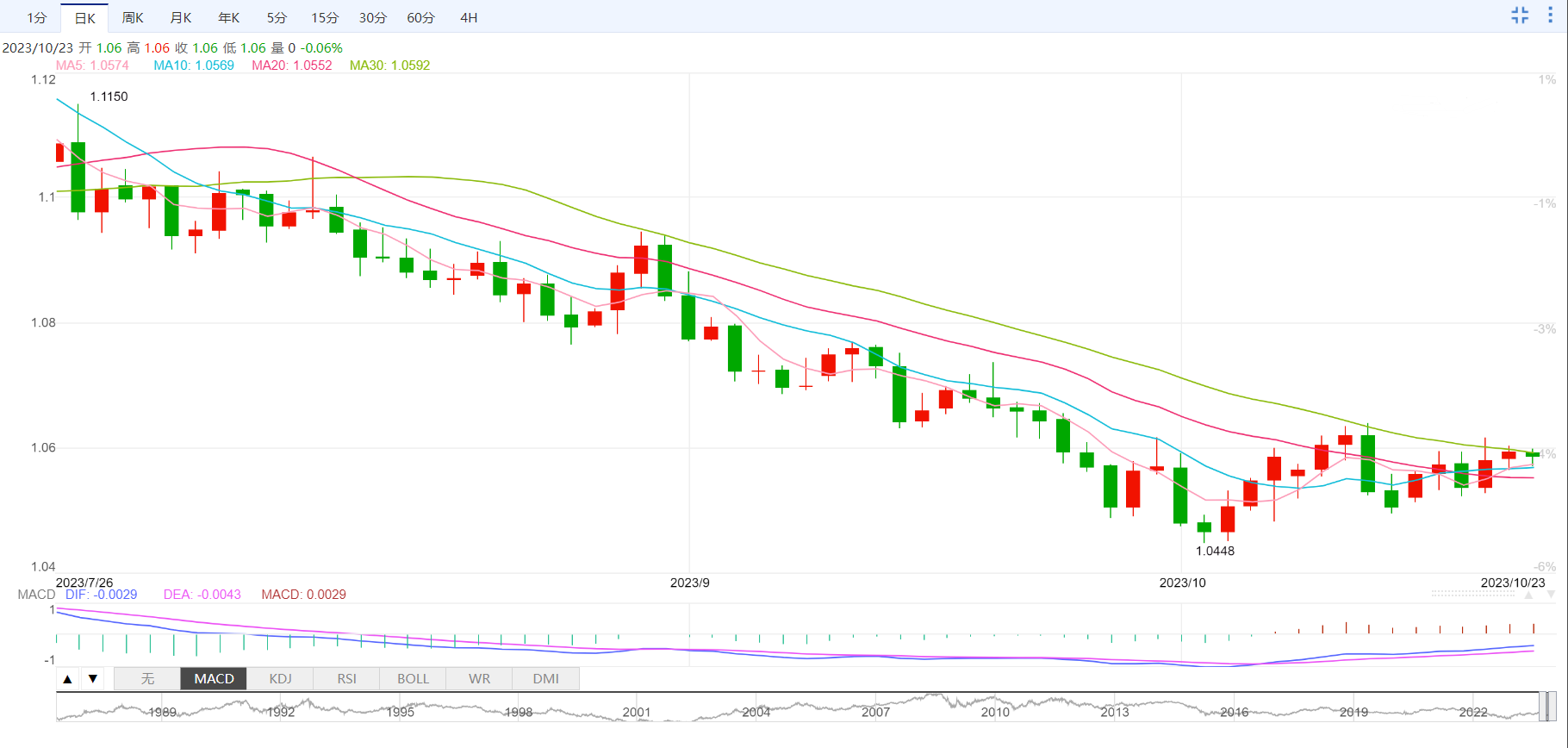 美元指数:截止发稿,美元指数上涨,现报106.23,涨幅0.08%。欧市盘前,美元指数始终在106.00的低位徘徊,目前风险偏好趋势交替。市场参与者继续关注中东的地缘政治局势,以寻找近期走势。在货币政策预期方面,投资者预计美联储将在11月1日的会议上维持利率不变,而12月加息的可能性仍然存在。
