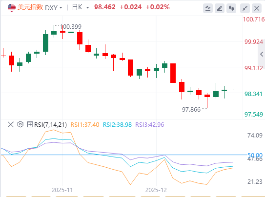 美元指数:截至发稿,美元徘徊在98.46附近。美元指数因美国通胀数据疲软而经历了周初抛售的稳定。虽然通胀缓降最初通过收益率下降对美元施加压力,但CPI报告质量的不确定性和全球央行信号混合,减缓了下行势头,使买方得以在明确的技术水平重新入市。技术面上,如果美元指数成功收稳在50日均线98.56以上,将朝最近的阻力位98.85-99.00方向移动。