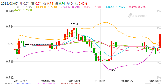 澳元兑美元:汇价现报0.7424,日内涨幅0.56%。澳洲联储公布利率决议显示, 维持当前1.5%现金利率于历史低水平不变,基本符合市场预期。决 议公布之后,澳元/美元短线反应较为清淡,汇价现交投于0.74关口 下方附近。