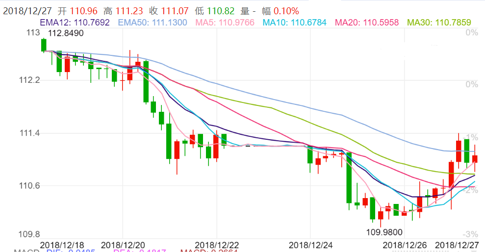 美元兑日元:汇价现报110.86,日内跌幅0.38%。美元/日元位于110.95附近水平徘徊。上一交易日汇价大幅反弹上扬,但触及110.40高点后展开回撤。