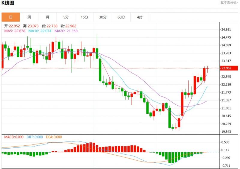 周四欧市盘中,现货白银报22.963,跌幅0.03%。